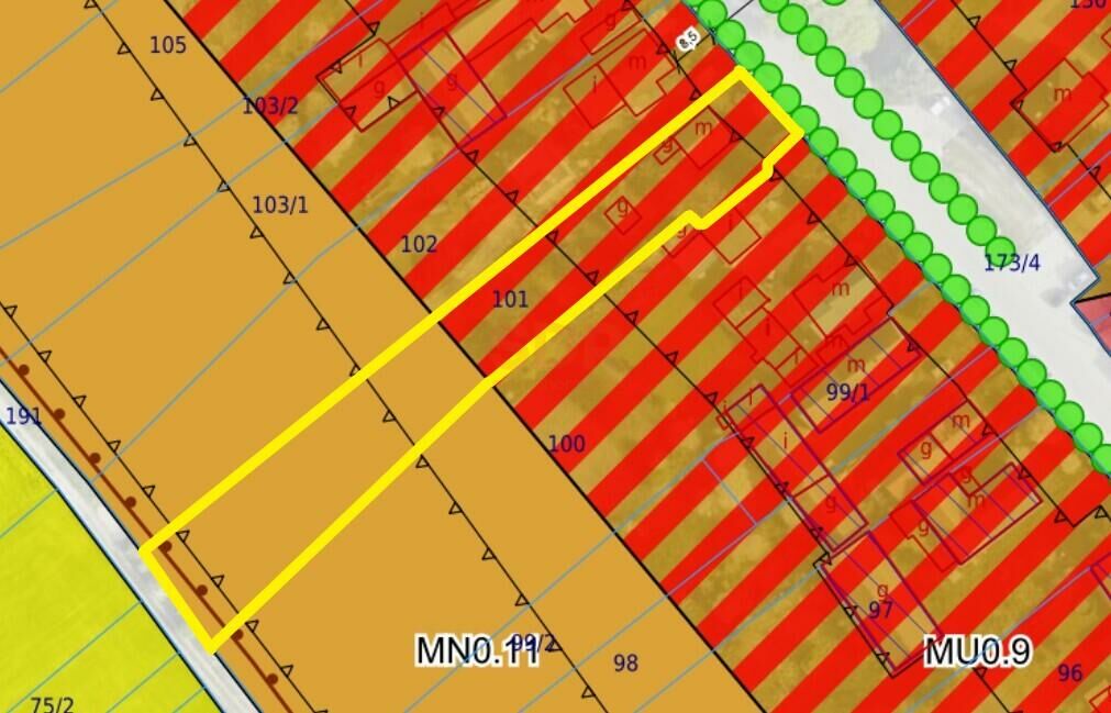Północna część działki jest oznacza w mpzp jako działka o przeznaczeniu MU - mieszkaniowo usługowym (ok 900 m2), a południowa o przeznaczeniu MN - mieszkaniowym (ok. 1300 m2)